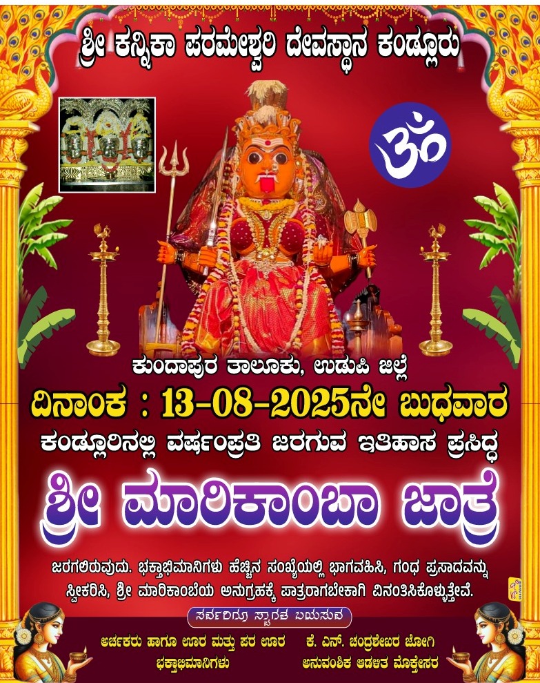 ಕುಂದಾಪುರ ತಾಲೂಕಿನ ಹಲವು ಶಕ್ತಿದೇವತೆಗಳ ದೇವಾಲಯಗಳಲ್ಲಿ ಕಂಡ್ಲೂರು ಶ್ರೀ ಕನ್ನಿಕಾ ಪರಮೇಶ್ವರಿ ದೇವಸ್ಥಾನವೂ ಒಂದು. ವಾರಾಹಿ ಮತ್ತು ಕುಬ್ಜಾ ನದಿಗಳ ಸಂಗಮ ಪ್ರದೇಶದಲ್ಲಿ ಇತಿಹಾಸ ಪ್ರಸಿದ್ಧವಾದ ಈ ದೇಗುಲವಿದೆ ಈ ದೇಗುಲದ ವೈಶಿಷ್ಟ್ಯತೆಯೆಂದರೆ ಶ್ರೀ ಕನ್ನಿಕಾ ಪರಮೇಶ್ವರಿ ಅಮ್ಮನವರು ಇಲ್ಲಿ ಲಕ್ಷ್ಮೀ, ಪಾರ್ವತಿ ಮತ್ತು ಸರಸ್ವತಿ ಮೂರು ದೇವಿಯರ ಸ್ವರೂಪದಲ್ಲಿ ವಿರಾಜಮಾನರಾಗಿ ಮೂರು ದೇವತೆಗಳ ಬಿಂಬರೂಪದಲ್ಲಿ ಪೂಜಿಸಲ್ಪಡುತ್ತಾಳೆ. ಈ ದೇಗುಲದಲ್ಲಿ ಆಗಸ್ಟ್ 13 ರಂದು ಅತ್ಯಂತ ವೈಭವದಿಂದ ಮಾರಿಜಾತ್ರೆಯು ನಡೆಯಲಿದೆ. ಹಿಂದೂ, ಮುಸ್ಲಿಂ ಮತ್ತು ಕ್ರಿಶ್ಚಿಯನ್ ಬಂಧುಗಳ ಸರ್ವಧರ್ಮೀಯರ ಸಹಭಾಗಿತ್ವದಲ್ಲಿ ಕಂಡ್ಲೂರು ಶ್ರೀ ಕನ್ನಿಕಾ ಪರಮೇಶ್ವರಿ ದೇವಸ್ಥಾನ ಮಾರಿಜಾತ್ರೆಯು ನಡೆಯುವುದು ವಿಶೇಷ ಸಂಗತಿಯಾಗಿದೆ.