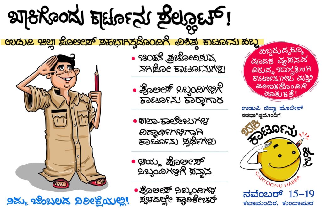 ಕಾರ್ಟೂನು ಕುಂದಾಪ್ರ ಇವರ ನೇತೃತ್ವದಲ್ಲಿ, ಉಡುಪಿ ಜಿಲ್ಲಾ ಪೊಲೀಸ್ ಇಲಾಖೆಯ ಸಹಭಾಗಿತ್ವದಲ್ಲಿ 12ನೆಯ ವರ್ಷದ “ಕಾರ್ಟೂನು ಹಬ್ಬ” ಈ ಬಾರಿ ನವೆಂಬರ್ 15 ರಿಂದ 19ರ ತನಕ ಕುಂದಾಪುರದ ಕಲಾಮಂದಿರದಲ್ಲಿ ನಡೆಯಲಿದ್ದು ಆ ಪ್ರಯುಕ್ತ ನವೆಂಬರ್ 15 ರಂದು ಮಧ್ಯಾಹ್ನ 2ಗಂಟೆಗೆ ಉಡುಪಿ ಮತ್ತು ದಕ್ಷಿಣ ಕನ್ನಡ ಜಿಲ್ಲೆಯ ವಿದ್ಯಾರ್ಥಿಗಳಿಗಾಗಿ “ಕಾರ್ಟೂನು ರಚನಾ ಸ್ಪರ್ಧೆ”ಯು ನಡೆಯಲಿದೆ.