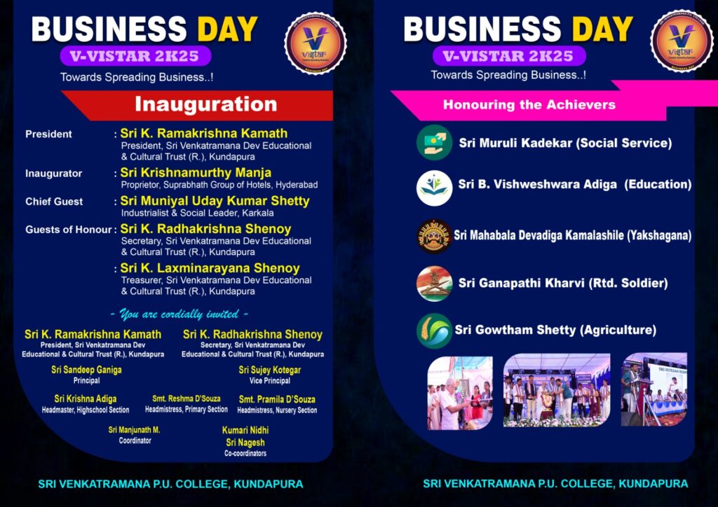 ಕುಂದಾಪುರ : ಡಿಸೆಂಬರ್ 6 ರಂದು ವಿ – ವಿಸ್ತಾರ 2K25 ಎನ್ನುವ ಶೀರ್ಷಿಕೆಯಡಿಯಲ್ಲಿ ಬೆಳಿಗ್ಗೆ 9.00 ರಿಂದ ಸಂಜೆ 6.00 ರ ವರೆಗೆ Business Day ಕಾರ್ಯಕ್ರಮ ಕಾಲೇಜು ಆವರಣದಲ್ಲಿ ನಡೆಯಲಿದೆ.